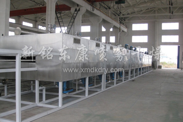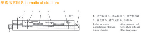物料由加料器均勻地鋪在網帶上,網帶一般采用12-60目不銹鋼絲網,由傳動裝置拖動在干燥機內移動。干燥機由若干單元組成,每一單元熱風獨立循環(huán),部分尾氣由專門排濕風機排出,廢氣由調節(jié)閥控制,熱氣由下往上或由上往下穿過鋪滿物料的網帶完成熱量與質量傳遞的進程,帶走物料水份。網帶緩慢移動,運行速度可根據物料溫度自由調節(jié),干燥后的成品連續(xù)落入收料器中。上下循環(huán)單元根據用戶需要可靈活配備,單元數量亦可根據需要選取。