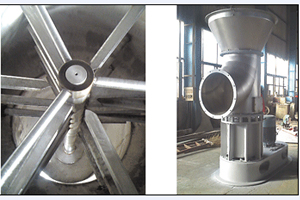 底部強化器設計獨特,攪拌齒為菱形,其流線性能使風阻達到低,設置在圓錐形料斗內,分動刀和定刀,粉碎效果顯著,使下落的結塊物料迅速粉碎為適合氣流干燥的粉粒料,攪拌的另一個主要作用是分散物料,加大了與料斗下面進來的高速熱風的接觸面積,于是料斗區(qū)形成了一個強烈傳熱傳質的流化床,大部分濕分在料斗區(qū)燥。隨著干燥的進行,變輕變細的干料受氣流作用明顯,與氣流一起上升并進一步干燥,然后從干燥塔頂部出來進入物料收集系統(tǒng)。