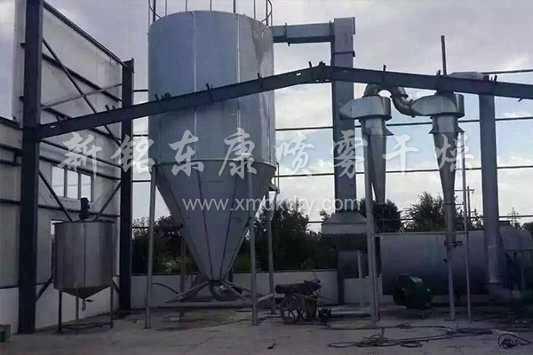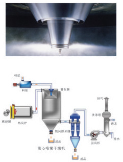 空氣經(jīng)過過濾和加熱,進(jìn)入干燥器頂部空氣分配器,熱空氣呈螺旋狀均勻地進(jìn)入干燥室。料液經(jīng)塔體頂部的高速離心霧化器,(旋轉(zhuǎn))噴霧成極細(xì)微的霧狀液珠,與熱空氣并流接觸,在極短的時間內(nèi)可干燥為成品。成品連續(xù)地由干燥塔底部和旋風(fēng)分離器中輸出,廢氣由風(fēng)機(jī)排空。